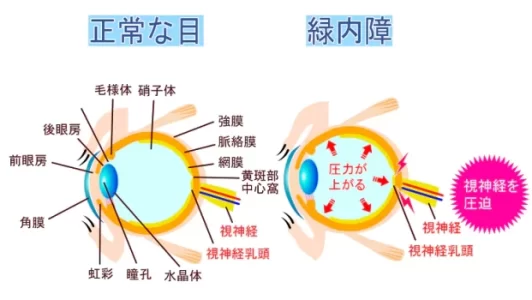 緑内障は眼圧が上がってしまうことで視神経が圧迫され、視野の欠損が生じてしまうことが原因とされます。